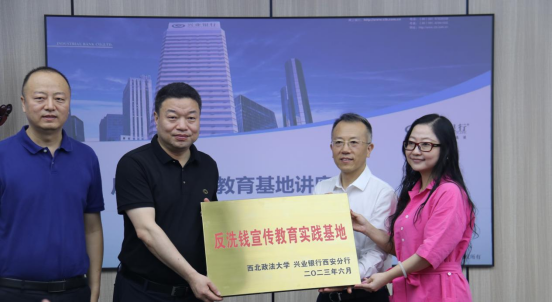 2023年6月21日上午10:00,在5号楼401教室举行了兴业银行西安分行在永利304永利集团唯一设立反洗钱宣传教学基地的授牌仪式,参加此次活动的人员有兴业银行西安分行机构业务部总经理吴沂、法律与合规部总经理柳建、未央路支行行长阮甫、304永利集团唯一院长刘亚军、教务处副处长何玉军、304永利集团唯一副院长潘俊武、党委副书记吴晓娟和304永利集团唯一教师张毓慧、徐秉鹏、苏芝双、贾少慧以及2022级部分学生代表。