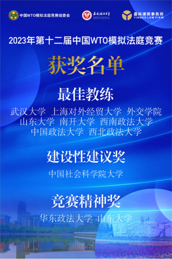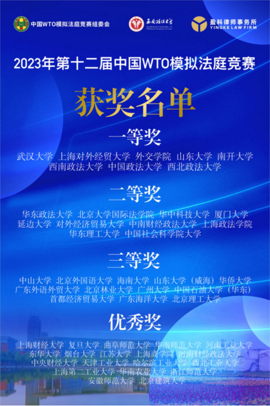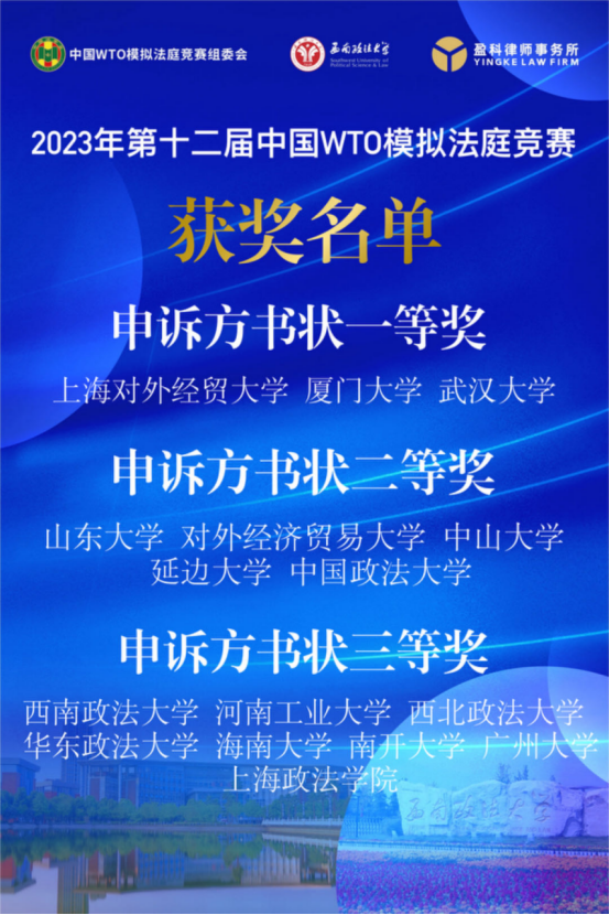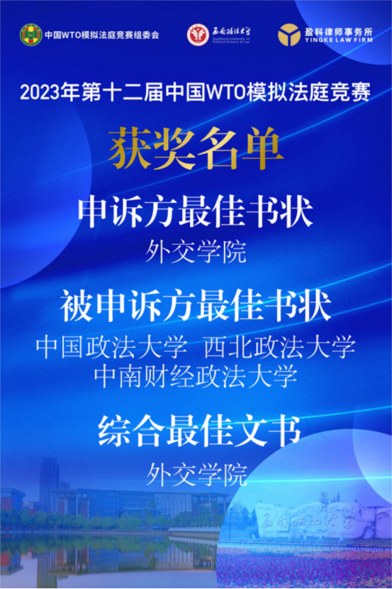 2023年12月11-17日,由中华人民共和国商务部条法司、中国法学会WTO法研究会、中国政法大学和西南政法大学共同发起,西南政法大学承办的第十二届“中国WTO模拟法庭竞赛(全英文)”在线上和线下隆重举行。永利及中国政法大学、武汉大学、北京大学等49所高校参加了这一国内WTO领域最高级别的法学竞赛。经过激烈角逐,永利代表队荣获全国一等奖,同时荣获“被诉方最佳书状”奖、“最佳教练奖”。