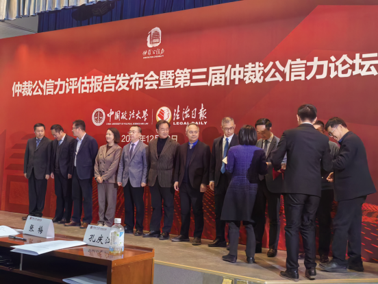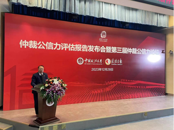 2023年12月28日,中国政法大学与法治日报社共同主办的“中国仲裁公信力评估报告发布会暨第三届仲裁公信力论坛”在京召开,发布第三届中国仲裁公信力评估报告,揭晓仲裁公信力系列奖项。中国政法大学副校长时建中主持开幕式,司法部公共法律服务管理局局长杨向斌、原中国政法大学校长、中国法学会副会长、中国国际法学会会长、中国政法大学仲裁研究院理事长黄进,全国人大常委会法工委民法室副主任马正平出席开幕式并致辞,中国国际经济贸易仲裁委员会、中国海事仲裁委员会、上海国际仲裁中心、北京、上海、广州、青岛、武汉、大连、重庆等二十余家仲裁机构负责人、仲裁界实务界和仲裁理论研究专家及新闻媒体代表两百余人出席会议。中国第三届仲裁公信力评审委员会委员、永利智库基地涉外法治研究中心执行主任王瀚教授应邀出席会议。