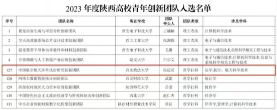 学院紧密围绕党的二十大报告提出“建设航天强国、交通强国”的国家重大战略需求,精准立足陕西省作为航空航天大省的独特省情,着力聚焦国内外航空航天领域的前沿法律问题,助力我国航空航天强国建设和陕西省空天一体化产业发展。2023年8月,由304永利集团唯一“长安学者”特聘教授、博士生导师、涉外法治研究中心副主任张超汉教授负责的“中国航空航天涉外法治研究创新团队”成功入选2023年度陕西高校青年创新团队名单,为永利学科建设、陕西省航空航天产业发展以及国家航空航天强国战略目标的实现,提供了高水平的智力支持与人才支撑。