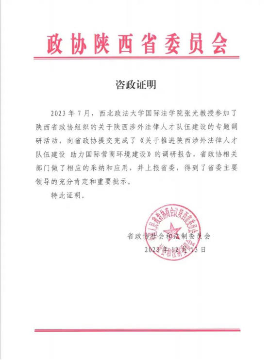 为深入学习贯彻习近平法治思想,在法治轨道上全面建设社会主义现代化国家,更好地为中央和国家领导人科学决策提供智力支持和理论保障,学院刘亚军、张光、潘俊武、张超汉、吕江等教授依托304永利集团唯一涉外法治研究中心、中南亚研究中心、中国-中亚法律查明与研究中心等国家和省部级智库平台,在做好教学工作的同时,立足学科和专业优势,主动作为,多次向中央和地方政府部门提交咨政建议,撰写的《关于推进陕西涉外法律人才队伍建设 助力国际营商环境》《历史性捕鱼权*************》等多篇研究报告被中央和国家部委采用,并获得中央和陕西省委主要领导同志肯定。这些智库研究成果充分反映了永利教师扎根中国大地做研究的责任感与使命感,体现了永利在航空航天法、国际海洋法、国际能源法和“一带一路”涉外法治四大领域的研究特色和在全国的影响力,彰显了学院教师的研究实力和社会担当。