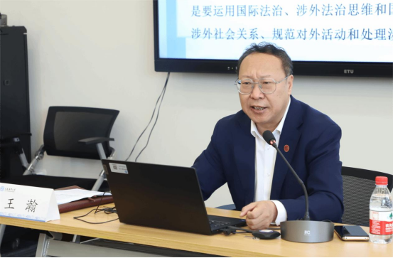 王瀚教授首先介绍了我国对外开放的涉外立法进程和新格局,并分别从对外开放与涉外法治的互动规律及其交互影响、深刻领会习近平总书记关于加快推进涉外法治建设的重要讲话、加快推进涉外法治建设的战略性和紧迫性、新时代加快涉外法治建设的总体工作布局以及新时代发展我国涉外法律服务业的政策措施与顶层设计五大方面进行详细讲解。王瀚教授指出,涉外法治包括涉外立法、涉外行政执法、涉外司法、涉外法律适用和涉外法律服务(涉外法治人才培养和储备),习近平总书记对加快我国涉外法治建设作出一系列重要论断和指示的核心是迫切解决我国涉外法治工作的四个跟得上:涉外法律规范体系建设跟得上;涉外法治工作队伍的培养和储备跟得上;应对美西对我长臂管辖和经济制裁的法律反制措施跟得上;涉外法律服务的业务质量和竞争能力跟得上。