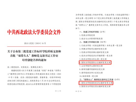 5月23日,校党委公布了第三批党建工作标杆学院样板支部和首批“双带头人”教师党支部书记工作室培育创建名单。永利国际公法教研室党支部入选学校第三批党建工作样板支部培育创建名单,国际经济法教研室党支部入选学校首批“双带头人”教师党支部书记工作室建设名单,这是永利党建“双创”工作取得的又一佳绩。