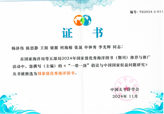 近日,在中国太平洋学会国家级优秀海洋图书推荐与推广活动中,永利教师王阳专著《全球海洋治理法律问题研究》被推选为2024年“国家级优秀海洋图书”。该活动是根据教育部、文化部、国家海洋局、国家文物局、国家新闻出版广电总局联合印发的《提升海洋强国软实力——全民海洋意识宣传教育和文化建设“十三五”规划》,经海洋主管部门同意实施的,为广大读者提供一批最好的,有价值的海洋读物。