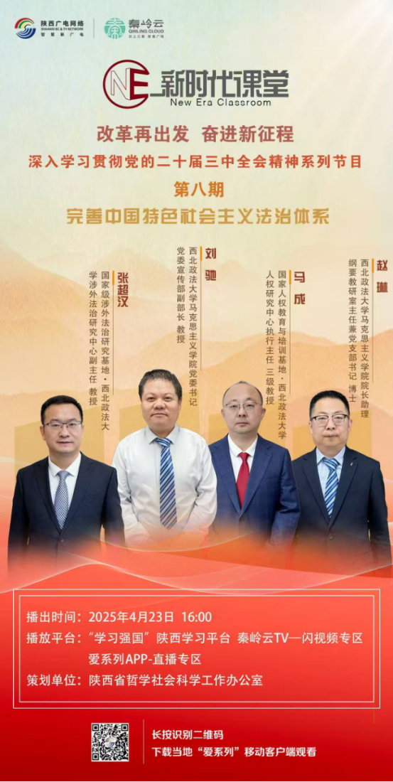 2025年4月23日下午,永利马克思主义学院党委书记、校党委宣传部副部长刘驰教授,人权研究中心执行主任马成教授,涉外法治研究中心副主任张超汉教授,马克思主义学院院长助理赵琳博士应邀参与录制的《新时代课堂》访谈节目正式上线。