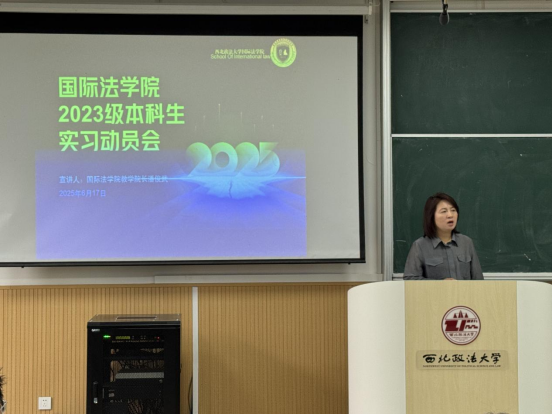 动员大会由辅导员苏芝双主持。潘俊武副院长在开场致辞中,从专业发展与职业成长的双重维度,深刻阐述了实习实践的战略意义,他鼓励同学们以高度的热情投入集中实习,主动将课堂所学的国际法律理论与实务场景紧密结合,在实践中锤炼专业素养。随后,教务秘书张毓慧对实习工作进行了全方位解读,围绕时间规划、岗位分配、过程管理、考核标准等核心环节展开细致说明,系统介绍了本年度20家合作实习基地的特色优势与资源禀赋,确保每位同学明晰实习流程与规范要求。最后,吴晓娟副书记着重强调实习纪律与安全管理,要求同学们严格执行实习日志制度,强化自我保护意识,严守实习单位规章制度,并建立常态化沟通机制,定期向指导教师汇报实习进展。