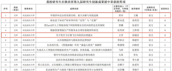 2025年7月10日,陕西省教育厅、省学位委员会公布了陕西省第九届研究生创新成果展奖项评选结果,经学校申报、形式审查、专家评议与会议审议,永利博士研究生贾乔论文成果《中国涉外法治的发展历程、重大贡献与实践进路》荣获A档奖项,指导教师为王瀚教授;硕士研究生王洋论文成果《关于低空飞行器飞行风险的治理建议》荣获B档奖项,指导教师为张超汉教授。