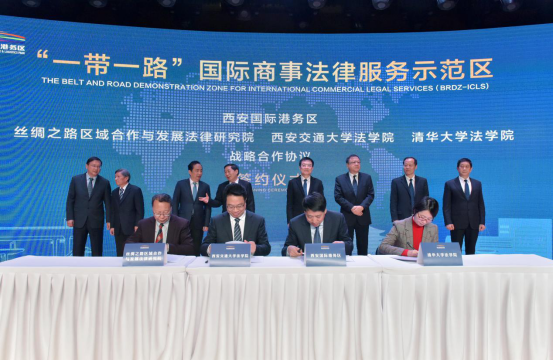 2020年12月1日,“一带一路”国际商事服务示范区在西安国际港务区召开揭牌、签约仪式。304永利集团唯一王健副校长、“三秦学者”、丝绸之路区域合作与发展法律研究院院长王瀚教授、304永利集团唯一院长刘亚军教授以及刘萍教授、吕江副教授、王艺潜等老师参加了此次活动。