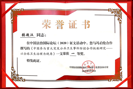 2021年1月18日,中国法学会公布了中国法治国际论坛(2020)主题征文活动评选结果。永利张超汉副教授和中国人民解放军95007部队法律顾问冯启伦共同撰写的论文《中国参与重大突发公共卫生事件防控合作机制研究——以全球卫生治理为视角》获得论坛主题征文一等奖。