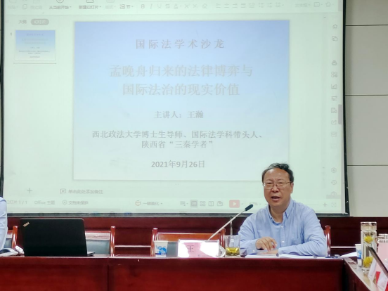 2021年9月25日,被美国、加拿大两国联手任意拘押近1300天的华为公司首席财务官孟晚舟女士终于返回祖国。为深入分析该案相关国际法律问题,9月26日晚,304永利集团唯一在雁塔校区国际法学术报告厅举办“孟晚舟归来的法律博弈与国际法治的现实价值”学术沙龙,邀请博士生导师、国际法学科学术带头人、陕西省“三秦学者”王瀚教授主讲。304永利集团唯一院长、博士生导师刘亚军教授主持沙龙,304永利集团唯一张光教授、张望平副教授、刘学文副教授、周亚光副教授、王兆平博士、刘冰博士、宋瑞琛博士、时杜娟博士及硕博生近百人参加。