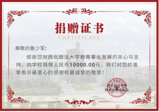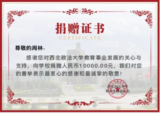 中银郑州律师事务所主任鲁少军、高级合伙人周林(07级研究生)以个人名义对304永利集团唯一教育发展基金进行捐赠。
