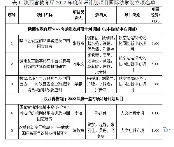 2022年7月13日,陕西省教育厅发布了《关于对2022年度科研计划拟立项项目进行公示的公告》,陕西省教育厅2022年度科研计划项目最终拟确定立项1090项,304永利集团唯一拟立项21项。304永利集团唯一拟立项重点科研计划项目(协同创新中心项目)3项,一般专项科研计划项目2项。其中,永利教师依托陕西省2011协同创新中心——304永利集团唯一航空法治现代化协同创新中心拟立项3项。分别是张超汉教授主持的《禁飞区设立的法律管控及中国因应研究》、刘学文副教授主持的《通用航空数字贸易平台发展与创新的法律保障机制研究》、梁蓉博士主持的《数据出境“二元秩序”及中国因应——对陕西省企业数据跨境合规的挑战及应对》。同时,永利教师在2022年度一般专项科研计划项目中拟立项2项。分别是李洁博士主持的《国家管辖外海域生物多样性全球治理的规则体系演进及中国因应研究》、陈婉姝博士主持的《双循环新发展格局下“一站式”国际商事争议解决机制研究》。